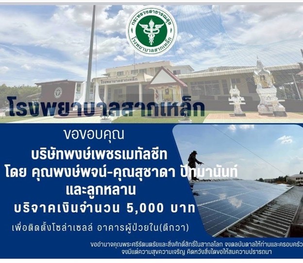 พงษ์เพชรกรุ๊ป ได้ร่วมบริจาคเงิน มูลค่า 5,000 บาท ให้กับโรงพยาบาลสากเหล็ก เพื่อติดตั้งโซล่าเซลล์ อาคารผู้ป่วยใน (ตึกวา) เพื่อเป็นประโยชร์แก่โรงพยาบาลและผู้ป่วย